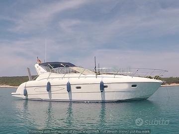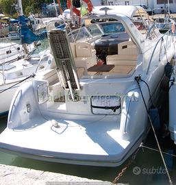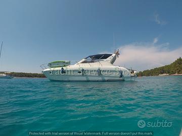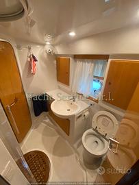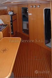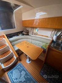 Plancetta di poppa lunga, passerella idraulica, comodo pozzetto rivestito in teak, dinette con tavolo pranzo, frigo esterno con lavello. Internamente abbiamo in classico calpestio in teak filettato acero bianco, una dinette con cucina, lavello a due vasche e 2 fuochi a gas, grande frigo, una cabina ospiti con letti a castello, ampia cabina matrimoniale a prua e un bagno completo di box doccia e doppio ingresso.