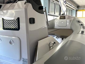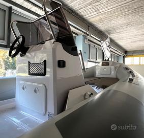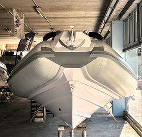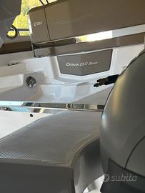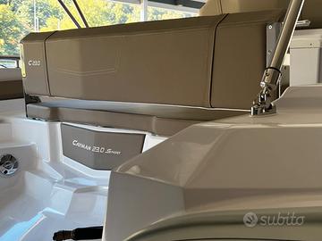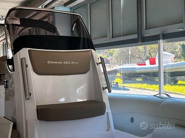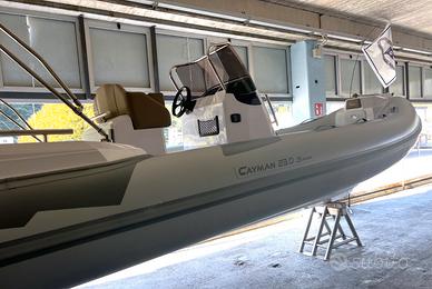 ll Ranieri Cayman 23.0 Sport è un gommone versatile e sportivo, apprezzato per la stabilità e le ottime prestazioni anche in condizioni di mare mosso. La carena è performante, consentendo una planata a bassa velocità ed una eccellente efficienza nei consumi. Questa unità, in pronta disponibilità, è ben accessoriata con Verricello elettrico, Tendalino Inox a doppio arco, Impianto doccia, Tavolo di poppa a ribalta, Tappezzeria Matrix , Tubolari bicolore, Consolle in tinta Ice Grey, Cuscinerie complete a cellula chiusa, Serbatoio carburante e Timoneria elettrica; Motorizzazione prevista ( da installare ) HONDA BF 115 DK1 Mecc. Silver Display Analogico