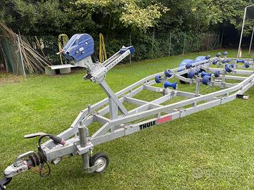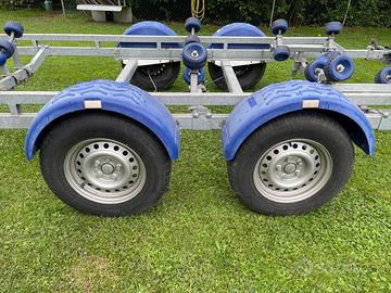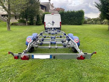 Carrello trasporto barche doppio asse, struttura del 2500kg declassato a 2000kg possibilità di riportarlo alla portata originale, revisione ok, sempre rimessato al coperto mai toccato acqua. Barra posteriore basculante per scarico in acqua mai usata. Tutto in ordine.