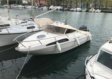 Vendo semicabinato Rio 550 cruiser, barca omologata CE cat C con motore Selva Murena 40cv 4t con 245 ore di moto.refittata completamente nell'anno 2022: impianto elettrico rifatto completamente, pompa di senti a automatica e manuale, stereo con 2 casse marine in pozzetto, luci di via nuove, luci a led in pozzetto e in cabina,carena rifatta da zero, materasso cuccetta fatto fare grosso per dormire comodi, cuscinetta esterna in buono stato , telo copribarca e telo per campeggio nautico, 6 parabordi nuovi, serbatoio benzina in inox 100 Lt con bocchettone esterno, serbatoio acqua 60 lt con pompa autoclave nuova, 2 batterie 2 porta betterie e selettore batterie tutto nuovo, dotazioni entro le 12 miglia, ecoscandaglio nuovo, barca in acqua 5 mesi all'anno poi ricoverata in capannone, manutenzione effettuata annualmente come la lucidatura di tutta la barca, barca attualmente rimessata in capannone al coperto. Vendo per passaggio a barca più grande.
