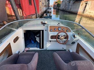 Motoscafo Rio 650 open con motore 3000 mercruiser alpha one 150cv . 300 ore Barca completa di documenti per adibirla a diporto commerciale trasporta 8 px Completa di - interni in teak -luci di via -luci interne -doppia batteria - due prese usb -staccabaetterie 2 vie -impianto stereo 4 casse hertz con bluetooth -impianto docetta 50l - scaletta acciaio scomparsa -Serbatoio benzina acciaio 180l -filtro decantatore - areatore vano motore - timoneria idraulica -pompa sentina -ancora 7kg -morse acciaio -cuscineria cabina in tessuto -cuscineria poppa, divanetti e poltrone (con copri in spugna) -volante bliz legno -tiemo con copri parabrezza Tag: open , cabin , rio , Ranieri, brube, Yamaha, Suzuki, honda , mercury, mercruiser, open , cofano, mt , spazio 5 walkaround, diporto commerciale