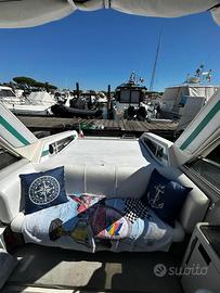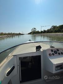 Semicabinato Rio 750 open m. 7,5, posti letto 3 con cuscineria nuova,ampi divani a poppa e prua, roll bar, verricello elettrico, impianto stereo nuovo e frigo, dinette, alloggio motore di riserva, spiaggetta, doccia a poppa, ecoscandaglio garmin, luci posizione, pompa sentina, gruppo termostato, batterie, trasmettitore trim completo, dotazioni di bordo, estintori.