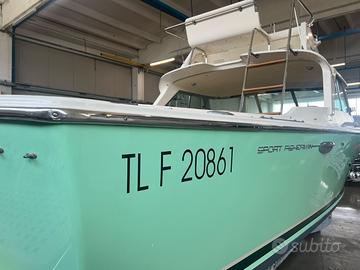 Cabina con 2 cuccette con armadietti, flying bridge con 2 posti di stazione, pozzetto prendisole , mobile bar , frigo, lavabo , dinette con divani e tavolo (trasformabili in letto), plancia comando a dritta . Scalette in teak .