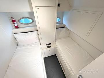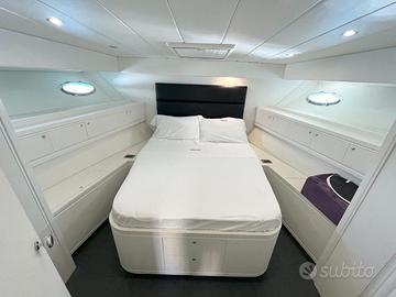 Cabina armatoriale prua con letto matrimoniale, armadi laterali e bagno privato con doccia;