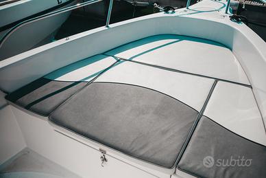 La barca è completa di tendalino 3 archi in acciaio inox, stereo bluetooth con casse nautiche, serbatoio da 60 lt di acqua dolce con doccino, serbatoio di benzina da 50 lt con indicatore in console, doppia batteria della varta da 70 A con deviatore batteria, pompa sentina, bussola, ampio prendisole di prua con grandissimo gavone sotto, comodissimo divanetto di poppa, luci interne led azzurre, presa usb e accendisigari, la barca viene venduta senza scritte aziendali e con tagliando fatto a giugno 2025 da officina mercury Taranto.