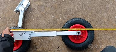 Ruote da alaggio per tender e gommoni, alluminio anodizzato, modello molto robusto, braccia estendibili, regolazione angolazione su tre posizioni sia in basso che in alto. Gomme da 30 cm di diametro, lunghezza totale 76 cm con braccio esteso, 61 cm retratto. Mai montate, mai utilizzate.