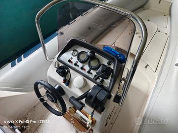 Gommone, anno 2006, mt. 5,90 x 2,58 con 1 motore (2 tempi iniezione con 260 ore di moto) fuoribordo benzina Evinrude E150DSL (150 hp) del 2008. Dotato doccia a poppa, scala bagno, tendalino copri gommone, tendalino parasole, tendalino copri consolle, ecoscandaglio, cuscini a prua, tavolo pozzetto. Nel prezzo è incluso rimorchio/carrello stradale (900 Kg) Umbra Rimorchi (2001). Il gommone è autovuotante ma ovviamente dipende poi dal peso extra che si aggiunge. Il gommone necessita di essere riparato ad un tubolare.