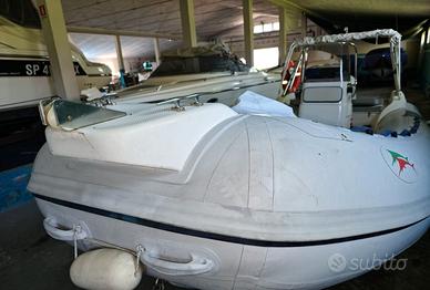 Gommone, anno 2006, mt. 5,90 x 2,58 con 1 motore (2 tempi iniezione con 260 ore di moto) fuoribordo benzina Evinrude E150DSL (150 hp) del 2008. Dotato doccia a poppa, scala bagno, tendalino copri gommone, tendalino parasole, tendalino copri consolle, ecoscandaglio, cuscini a prua, tavolo pozzetto. Nel prezzo è incluso rimorchio/carrello stradale (900 Kg) Umbra Rimorchi (2001). Il gommone è autovuotante ma ovviamente dipende poi dal peso extra che si aggiunge. Il gommone necessita di essere riparato ad un tubolare.
