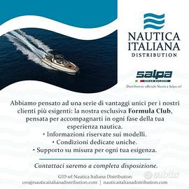GID Nautica Italiana Distribution propone questo splendido Salpa Avantgarde 35, Nuovo. Consegna Giugno Oltre alla dotazione standard la seguente configurazione prevede: - Motorizzazione con coppia di YAMAHA F300NSB - Seconda scaletta bagno - Tenda da sole posteriore con pali in carbonio - Tavolo con doppio supporto assistito manuale - Sistema ancoraggio con musone telescopico, ancora inox kg 11 e 50 metri catena - Illuminazione a led interna ed esterna - Kit luci di cortesia in coperta - Luci subacque - Contacatena La produzione è ormai agli sgoccioli, l'estate è alle porte, non rischiare di rimanere a terra. Preparati a vivere il mare! Contattaci e saremo felici di fornirti tutte le informazioni di cui hai bisogno, troveremo la soluzione su misura per te. Attiva la nostra Formula Club Tu navighi, al resto pensiamo noi. Servizi dedicati, manutenzioni, assistenza, coperture assicurative e gestione completa del mezzo. GID Nautica Italiana Distribution è concessionario ufficiale SALPA