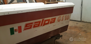 Imbarcazione Salpa Gs16 completamente smontata per leggero refitting ( mai effettuato per mancanza di tempo) con TUTTE le parti originali. Cantiere conosciuto per la solidita delle imbarcazioni. Modello con la prua chiusa con sotto lettino o vano porta attrezzatura e sopra ampio prendisole ( INTROVABILE).La barca e fuori dall acqua da piu di 10 anni e ricoverata in capannone. Lo stato di manutenzione e ottimo. Nella vendita e compreso carrello Ellebi in ottimo stato di manutenzione da revisionare.AFFARE IMPERDIBILE!!! PREZZO TRATTABILE!!