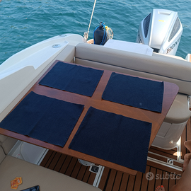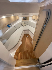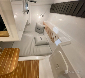 bagno separato con wc elettrico e serbatoio acque nere, specchio, roll-bar, GPS Ray marine, pensili in cabina dx e sx, illuminazione int ed est full led, fornello a gas, frigo in pozzetto, impianto doppia batteria, salpa ancora elettrico 500 w, con musone inox, ancora 7,5 kg, catena 30 mt, impianto stereo con casse in pozzetto con connessione bluetooth, impianto elettrico 230v con carica batterie e cavo per colonnina, teak sintetico, telo copri consolle, porta scorrevole, cappottina copri pozzetto XXL con chiusura notte ad archi in inox, completo di parti laterali e posteriore,