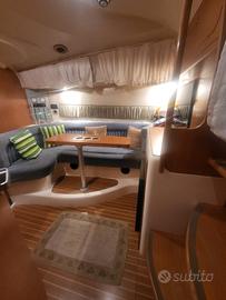 INTERNI: cabina di prua con grande letto a murata, divanetto e ampio armadio per i bagagli, cabina di poppa con letto doppio trasformabile in matrimoniale a tutto baglio, poltroncina, armadio e gavoni, altezza uomo all'ingresso. Entrambe le cabine sono dotate di porta di ingresso. Bagno separato con wc, bidé e lavello integrato nel mobile con stipetti vari, vaschetta per l'evacuazione dell'acquia della doccia. Dinette trasformabile in letto singolo e mobile cucina con frigo, due fuochi, microonde, stipetti vari.