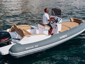 Bellissimo gommone Salpa Soleil 18 - nuovo modello! PACKAGE con motore Honda BF40E. PRONTA CONSEGNA! Motorizzato con motore Honda BF40E, 5 anni di garanzia. Caratteristiche tecniche: Lunghezza f.t 5.99 mt Larghezza f.t. 2.48 mt Portata Persone : 8 Diametro tubolari max : 58 cm Materiale tubolari: Hypalon Carena: Single step Categoria CE : C Peso a vuoto kg 550 (Senza Motore) Motorizzazione minima: 40/60 hp Deadrise medio : 25° Accessori standard: 3 Ganci traino e ormeggio, 4 bitte in acciaio inox, bussola, consolle guida sport edition, cuscineria completa a cellule chiuse, gavone ancora con portello e rullo, gavone sotto il divano di poppa, gavoni sotto prendisole di prua, impianto elettrico completo, parabrezza con girocassero inox, plancette poppa VTR ,pompa di sentina elettrica automatica, quadretto elettrico al cruscotto, scaletta mare inox a scomparsa, tromba elettrica, luci di navigazione, vano porta-batteria, stacca-batteria, volante Salpa a 3 razze e gonfiatore manuale. Gommone e motore NUOVO, Incluso di motore Honda BF40E. Prezzo iva inclusa! PRONTA CONSEGNA! Package con motore: - Gommone Salpa Soleil 18 + motore Honda BF40E: 24.500 euro + iva - Gommone Salpa Soleil 18 + motore Mercury 40 PRO: 25.500 euro + iva - Gommone Salpa Soleil 18 + motore Yamaha 40 Supreme: 26.500 euro + iva - Gommone Salpa Soleil 18 + motore Honda BF100: 28.900 euro + iva - Gommone Salpa Soleil 18 + motore Mercury F100: 30.200 euro + iva - Gommone Salpa Soleil 18 + motore Honda BF115: 29.900 euro + iva - Gommone Salpa Soleil 18 + motore Mercury F115 PRO XS: 32.200 euro + iva Motore finanziabile a tasso zero in 24 rate! Disponibile anche altri modelli della gamma SALPA! Motore finanziabile A TASSO ZERO in 24 RATE! Possibilità di consegna in tutta Italia con ns mezzi. Cantiere Ferrario Nautica a Dormelletto (NO), concessionario Salpa per il Piemonte, Lombardia e Lago Maggiore.