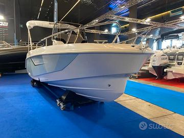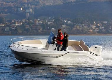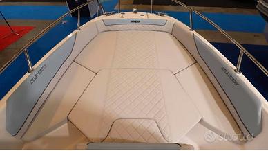Dotazioni standard incluse nel prezzo: Carena bianca con murate colorate (Nero o Azzurro), coperta colore bianco, pulpito di prua in acciaio, bitte, musone, pompa di sentina elettrica, impianto elettrico 12v, pannello elettrico con 6 interruttori, presa 12v per ricarica cellulari, bussola, tromba, luci di navigazione, cruscotto, parabrezza, volante, golfare a prua e golfari a poppa, scaletta in acciaio inox a 4 gradini, seduta pilota e copilota, autoclave, doccetta sulla plancetta di poppa, rubinetto sotto la seduta di guida, tappezzeria luxury con cuciture a rombi in coordinato con il colore delle murate, kit prolunghe prendisole a poppa e prua, tavolo in pozzetto e portaoggetti laterali.