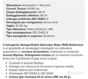 Salvagente Autogonfiabile Spinnaker Baby 150N Giallo nuovo mai utilizzato adatto per bambini dai 20/50 KG