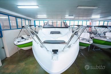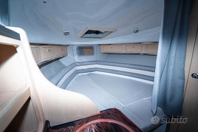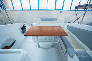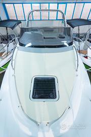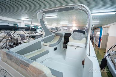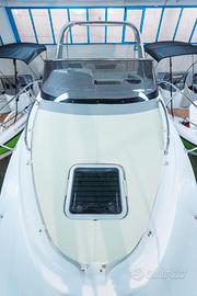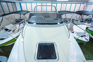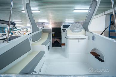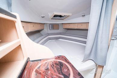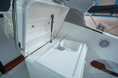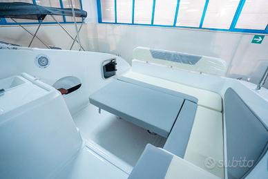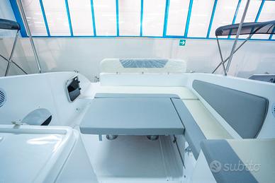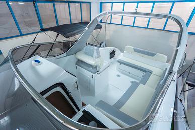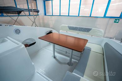 Corrimano in acciaio INOX, Parabrezza, Rollbar con luci di via, Passo uomo, Scaletta bagno, Pulsantiera utenze, Volante, Musone di prua, Sedile guida a 2 posizioni abbattibile con gavone sottostante, Divano poppa, Cuscineria completa interna ed esterna, Porta scorrevole ingresso in cabina, Cabina con dinette a "U" trasformabile in letto matrimoniale, Locale toilette separato con WC elettrico e lavello con rubinetto estraibile, Mobile cucina con lavello completo di rubinetteria, N°3 oblò laterali, Nà4 punti luce, Pompa di sentina, Tromba, Bussola, Serbatoio carburante da 270 lt, Serbatoio acqua da 70 lt ca, Staccabatteria, Impianto doccia, Cabina lato poppa con 2 posti letto, Prolunga prendisole di poppa, Kit tavolo, Impianto serbatoio acque nere.