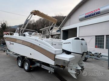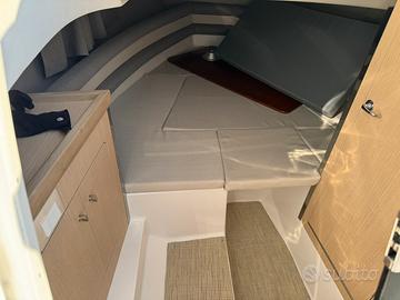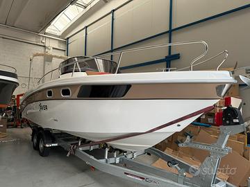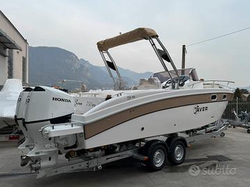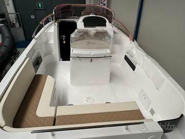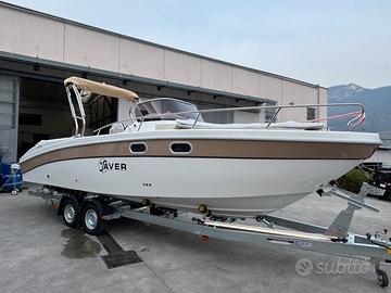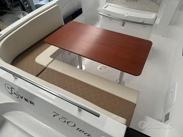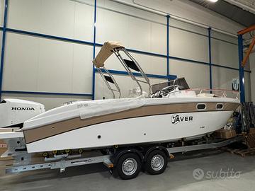 Barca Saver 750 Walk Around nuova NEW model year 2026 restyling Il restyling presenta queste modifiche: incremento dell'altezza in cabina , la console modificata , un innovativo sedile posteriore esterno a forma di L, nonché miglioramenti nell'accessibilità e un passaggio ottimizzato nel pozzetto posteriore. dotazioni: -cuscineria completa interno esterno -pannello elettrico ed impianto batteria -lavello interno ed esterno -doccia con autoclave e serbatoio 70 lt -pompa sentina -tromba -bussola -serbatoio carburante lt 290 con impianto -luci di navigazione -luci di cortesia interno esterno -scaletta di risalita -wc in locale separato + Impianto acque nere -cabina con letto e mobiletto legno -passaggio a poppa -prolunga prendisole -kit tavolo OPTIONAL : - colore scafo striscia - plancette extralunghe con scaletta a scomparsa - cuscino fronte consolle - Timoneria idraulica - verricello elettrico - frigorifero - rollbar inox black con doppio tendalino - schienale poppa coppia motori HONDA BF 150 D comandi elettronici strumentazione digitale impianto doppia batteria caratteristiche tecniche: lunghezza FT cm 775 larghezza FT 255 peso kg 1500 portata persone n. 8 Prezzo promo in offerta Euro 65900,00 + iva FOTO INDICATIVE