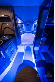 Cabina di poppa con letto matrimoniale, oblò con tenda, luci di cortesia e faretti illuminazione