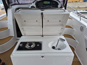 Ancora, Autoclave, Auto-Trim, 3 Batterie, Caricabatterie, Cavo corrente di banchina, Colorazione speciale, Corrimano, Doccia esterna, Luci di cortesia, Pompa di sentina elettrica, Ponte in teak, Pozzetto Teak, Presa 220V banchina, Salpa Ancore Elettrico, Scaletta da bagno, Tavolo pozzetto, Tromba, T-Top, Winch.