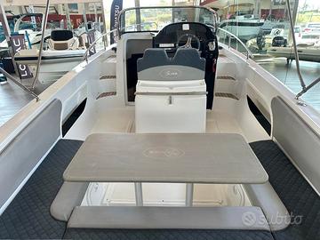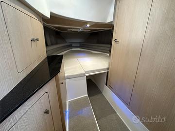 si conferma punta di diamante del cantiere, grazie all'equilibrio perfetto tra prestazioni, confort e versatilità. Ideale per chi cerca un'imbarcazione di circa 9 metri, è perfetta sia per crociere giornaliere che soggiorni a bordo. La dinette, oltre al divano a 'U', trasformabile in ampio prendisole, include anche un angolo cottura proprio dietro il blocco di seduta, con un lavello e la possibilità di adottare un fuoco, oltre ad un frigorifero ad incasso. La console è ampia per installare tutta la strumentazione di bordo necessaria e condivide la superficie con una porta scorrevole in cristallo che offre accesso all'area notte. L'ampio parabrezza avvolgente protegge chi pilota dal vento. Se di giorno la 870 WA è una divertente compagna da vivere con la famiglia o gli amici, di notte si trasforma in un camper nel quale possono prendere posto 3/4 persone in aree separate. Ad un letto matrimoniale disposto a prua risponde infatti un secondo letto per gli ospiti verso poppa, completo di tendina scorrevole. La 870 WA dispone di un locale toilette separato con WC elettrico maceratore, lavello e doccia acqua calda/fredda. A prua troviamo un ampio prendisole. A poppa le plancette sono due dove troviamo alloggiato un bel SUZUKI 350cv che riesce ad ottenere prestazioni di oltre 35 nodi. Tra i numerosi accessori spicca l'elica di prua, che grazie al pratico joystick, rende le manovre di ormeggio semplici e intuitive negli spazi più ristretti.