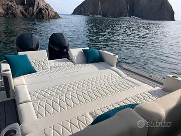 La postazione di pilotaggio è allestita con doppio display RAYMARINE da 12? con Mercury vesselview integrato, manette elettroniche, comando elica di prua, stazione ricarica Wireless per smartphone.