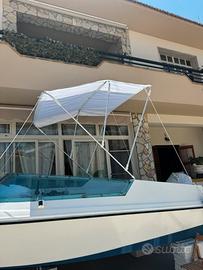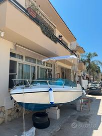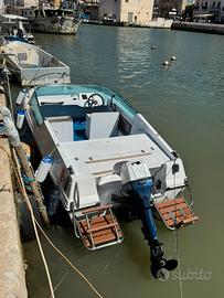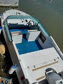scafo pronto alla boa completo di tutto motore 40 cavalli 2T Johnson 737 modello vecchio mai avuto un problema ogni anno ho fatto il rimessaggio la barca comprende tendalino nuovissimo cuscineria nuova usata solamente una stagione ecoscandaglio,luci di navigazione,pompa sentina, ancora da sabbia, kit dotazione entro le 3 miglia. Per qualsiasi prova a vostra disposizione per qualsiasi video in privato. Accetto scambi, ma non affaristi