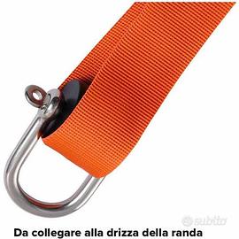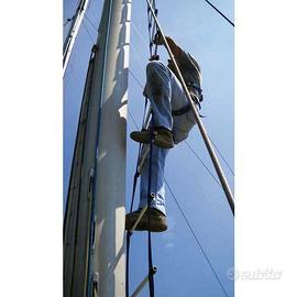 Questa scala per albero possiede alla base due code con asola che vanno fissate ad un elemento stabile, idealmente alla base dell'albero, a destra e a sinistra del boma. In testa, la scala ha un ulteriore asola rinforzata con grillo in acciaio inox da collegare alla drizza della randa; andremo quindi a tesare (tramite winch) fino a raggiungere la massima tensione dei nastri. A questo punto la scala risulterà rigida e stabile grazie al sistema auto strozzante di ogni gradino.