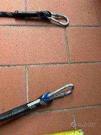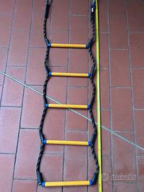Scaletta di corda da barca gommone 5 gradini Extralunga con gradini in plastica rigida, aggancio tramite moschettoni, completa di sacca (con una piccola scucitura come in foto), lunghezza circa 130 cm, larghezza circa 30 cm., vendo per cambio progetto.