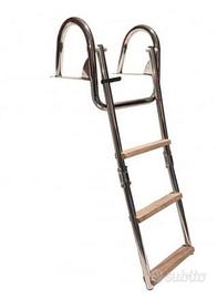 Scaletta acciaio inox pieghevole con corrimano e gradini in legno per plancette di poppa. Mai usata, perché non compatibile. E' stata saldata una barretta, facilmente rimovibile, nel tentativo di montaggio