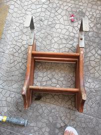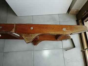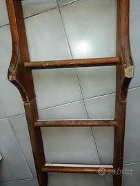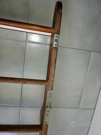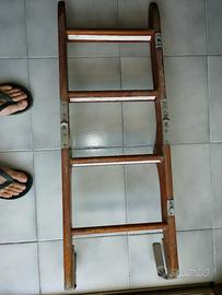 Scaletta in legno per barca con agganci per paratia. La scaletta è pieghevole con 4 gradini. La lunghezza massima è di 90cm circa. Condizioni generali buona come da foto con qualche imperfezione dovuta all'età.