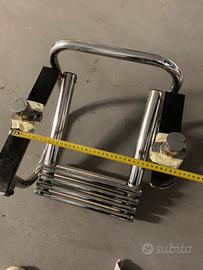 Vendo scala pieghevole sopra plancia in tubo diam. 25 cm. In acciaio inox AISI 316L lucidato a specchio con 4 gradini con inserto in legno iroko completo di bicchieri per la plancia.