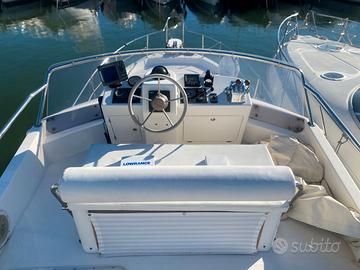 Unità in condizioni eccellenti, costantemente manutenzionata e aggiornata. Motorizzazione 2 Volvo Penta KAD 43 – 231 cv con circa 569 ore. Costruzione 2000, varo 2001 Categoria CE A/B. Lavori recenti (2026): • Carena portata a zero, primer + antivegetativa navale • Legni esterni portati a zero e rifiniti trasparente opaco • Verifica draglie e candelieri • Tagliando completo motori: olio, filtri, prefiltri Racor, giranti, guide distribuzione, ispezione sala macchine Dotazioni e aggiornamenti principali: • Passerella idraulica (impianto 2020, motore/idraulica 2022) • Pilota automatico, profondimetro, VHF (plancia + fly), antenna VHF 2023 • GPS Lowrance con cartografia (fly, 2020) • Salpa ancora elettrico con triplo comando • Ancora Bruce + 60 m catena (linea verificata e marcata 2023) + ancora di rispetto • Impianto 220V da banchina (cavo 2021) • Antenna TV 2020, radio Bluetooth 2020 • Piastra induzione 2 fuochi, fornello gas 2 fuochi, lavello inox (2020) • Frigo 12V • Boiler 220V + recupero calore (2021) • WC elettrico nuovo 2025 • Docce interne/esterne con miscelatori nuovi • Autoclave 2020 • Tende interne complete 2021 • 3 batterie VARTA 180Ah (2025) + caricabatterie Bluetooth (2023) • Aria condizionata caldo/freddo (2020) • Prese a mare e saracinesche ottone (2020) • Predisposizione generatore benzina (2020) • Cuscineria completa fly/pozzetto 2020 • Tendalino poppa 2020, teli chiusura totali 2023 • Luci interne LED 2022, luci via/fonda 2020 • Dotazioni sicurezza 12 NM + zattera 2023 • Gavone pozzetto riorganizzato per cambusa, attrezzi, ricambi, pesca, generatore 2.2 kW Interventi 2020 post-acquisto: Tagliando esteso motori, revisione timoneria idraulica, verifica completa impianti 12/220V, nuovo quadro sentine con allarmi, sostituzione tubazioni idriche, presa acqua da banchina con filtro, verifica scafo/linee d’asse, lucidatura completa, sostituzione guarnizioni finestre/oblò, trattamento legni interni annuale, trattamento antiacaro/ozono.