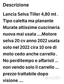 Bellissima barca da pesca motore selva 20 cv 2022 .. barca a secco dal 2023 ... possibilità di carrello ....cuscineria nuova mai usata .. barca valida per pescare e per godersi il mare, facile da condurre anche per persone poco esperte ......prezzo trattabile dopo visione ...