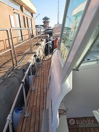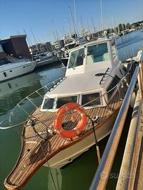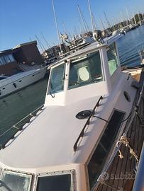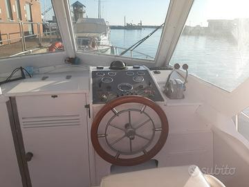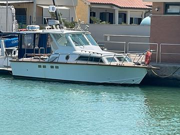 Semicabinato Tognacci Smeraldo, carena a V profonda, progetto Levi, linea d’asse. Oggetto di profonda ristrutturazione che ha interessato opera viva e morta, con restauro e verniciatura dello scafo, ponte rifatto completamente sia strutturalmente con mogano massello e sia il rivestimento di iroko da 14 mm. Due motori Aifo 806, 6 cilindri in linea, diesel aspirati, con 130 cv. l’uno. ( circa 800 ore di moto). Installate tre batterie, due servizi 180 e 200 Ah ed una batteria motore da 220 Ah. Caricabatterie Victron da 30 Ah con relativo attacco in banchina. Serbatoio acqua 150 litri, pompa autoclave nuova per doccetta ed acqua cucina. Tre serbatoi gasolio, nuovi con linea carburante rinnovata, ripartiti a poppa per un migliore bilanciamento, 280 litri totali. Pompa acqua di mare con presa a mare ed erogatore dedicato. Ecoscandaglio/GPS Simrad da 9 pollici. Bagno con wc nuovo, manuale. Cucina due fuochi, frigo. Tendalino copri ponte. Prezzo molto ribassato per una vendita veloce