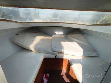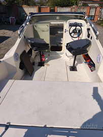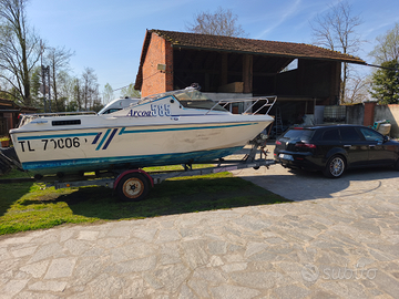 Vendo barca semicabinato Arcoa 5,85m. Barca in vetroresina scafo molto stabile sul mare, cockpit molto spazioso in confronto ad altri modelli delle stesse dimensioni. Motore OMC Cobra da 3l, 140cv. La barca l'ho comprata due anni fa, ho rifatto tutto l'impianto elettrico è cambiato tutto il quadro strumenti, contachilometri con GPS, impianto stereo nuovo e verniciato la cabina. Tendalino e scaletta nuova. Il vecchio proprietario non l'ha usato tantissimo e io l'ho usata per tre settimane all'anno poi sempre tenuta in garage. Il cambio olio del motore sarà fatto prima della messa in acqua e la sostituzione dell'accensione delle candele con una accensione elettronica (comprato ma non ha avuto tempo per sostituire). Barca molto veloce 35 nodi da libretto, Io non ho mai superato il 28 per famiglia a bordo o condizioni meteo non favorevole. Vendo compreso di carrello, il vecchio proprietario ha tolto i freni in quanto arrugginiti, a me non servivano in quanto trainavo con un fuoristrada, può fare qualunque distanza ma per passare la revisione consiglio di cambiare il semiasse ( nuovo 450€). Vendo per passaggio a una barca più grande.