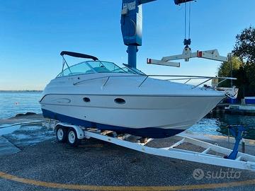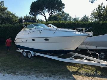 Vendo per passaggio a categoria superiore bellissimo Natante Sessa Oyster 25. Questo Day-Cruiser coniuga un bel pozzetto vivibile con tavolo in compensato marino ripiegabile, con una comoda cabina con cuccetta matrimoniale e dinette trasformabile in due comodi posti letto. Cucina, forno microonde, frigorifero, TV, stereo, acqua calda, lavandino esterno, doccia calda e fredda esterna. Cuscineria prendisole originale Sessa sulla tuga. Monta un motore a benzina VOLVO PENTA entrofuoribordo con elica dual prop da 265,00 CV con 828 ore di moto, che gli consente di raggiungere una velocità di tutto rispetto attorno ai 40 Kn. Provvista di elica di prua e salpa ancora elettrico. Imbarcazione molto maneggevole si presta ad essere utilizzata anche da piloti non espertissimi. Ottime condizioni, certificate da Perizia ufficiale del 2025 visionabile a richiesta. Cuscineria esterna rifatta nel 2023, plancia tuffi rifatta con teak sintetico nel 2020, tagliandi periodici documentabili. L’impianto elettrico è dotato di due batterie da 100 Ah una per l’avviamento dei motori ed una per i servizi, tutte comandate da stacca batterie. Pavimento in Gel coat in ottime condizioni. Luci di navigazione nuove. Luci di cortesia interne ed esterne funzionanti. Lucidatura del gel coat esterno del 2024. E’ presente l’impianto banchina a 220 V, a servizio del carica batterie e del boiler con cavo relativo. Impianto TV, Radio, e VHF. Ecoscandaglio Garmin GPS del 2024. WC elettrico con doccia con scarico diretto. Pompa di sentina automatica. Tendalino e telo copripozzetto rifatti nel 2022. In acqua solo per quattro mesi all'anno. Visibile su appuntamento in darsena sul lago di Garda dal 1 Maggio. Misure: Lunghezza 7,40 Larghezza 2,55 Pescaggio 0,60. Portata 7 Persone. Cat. B, 630Kg. Natante carrellabile. Carena con antivegetativa fatta ogni anno di utilizzo. Nessuna riparazione. Se richiesto, si può includere il costo dell'ormeggio in acqua fino al 30/9 e assicurazione Kasko.
