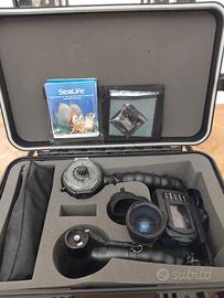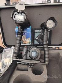 vendo per inutilizzo set per riprese subacquee perfettamente funzionante, come da foto è tutto conservato con la massima accortezza. Non è presente la fotocamera in quanto rotta dopo utilizzo.