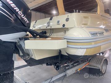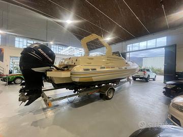Per passaggio ad altra tipologia, vendo Gommone Solemar 27 Oceanic con Braket in vetroresina con 2 motori Mercury Verado da 275 CV in ottime condizioni e appena tagliandati, installata Elica di Prua, Impianto Elettrico rifatto, 2 serbatoi acqua di cui uno a prua da 120 Lt e l'altro in acciaio inox da 150 Lt, serbatoio benzina in acciaio da 300 Lt, frigo in dinette perfettamente funzionante, bagno nautico in dinette separato, 2 doccette esterne, una a prua e una a poppa, 2 batterie nuove da 120 Ah, Lavabo Interno, fornelli a gas, Salpa ancora con doppio comando in consolle e a prua, Flap idraulici, 4 oblò apribili + 1 passo d'uomo, Rollbar con luci di via tromba e casse radio, Autoradio, enorme Gavone a Poppa dove erano installati 2 motori entrofuoribordo, pompa di sentina, autoclave, Cabina con altezza 180 cm 4 posti letto interni piu' 2 esterni, 2 Grandi Prendisole anteriore e posteriore, Tendalino anteriore e posteriore, Chiusura esterna con Tenda nautica integrale, telone invernale, Tavolo esterno e antivegetativa. Il Gommone appena lucidato è visibile a Rieti previo contatto telefonico. Luigi 3665410723