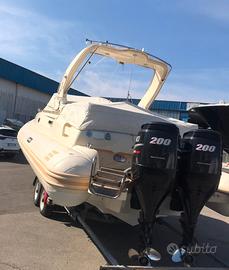 Solemar 28 Oceanic, Natante, motorizzato con 2x200 Suzuki. Full optional: Tessuto color Panna Exsclusive, Roll Bar in vetroresina con luci di via, asta porta bandiera con luce 360 e tromba acustica, tendalino parasole con arco inox sul roll bar, musone di prua in vetroresina con salpa ancora completo di verricello elettrico, ancora e 50 Mt. di catena, consolle con parabrezza fumè, check panel elettronico, volante sportivo, cuscineria prendisole di prua, cuscineria prendisole di poppa, tientibene in acciaio inox di prua e di poppa, divano poppiero con tavolo pranzo e completamento letto/prendisole, rivestimento in teak su piano di calpestio, plancette di poppa con rivestimento in teak, angolo cottura esterno con fornello a gas, lavello, frigorifero esterno molto ampio, doccia serbatoio e autoclave, arredamento cabina con letto matrimoniale di prua e letto di poppa, locale separato con wc elettrico, doccia e lavandino, interni in tessuto, N. 2 serbatoio carburante con strumenti indicatore livello, boiler acqua calda, carica batterie elettronico 220 V, presa di corrente 220 V in cabina, VHF, navigatore a colori con ecoscandaglio, radio stereo, luci di camminamento in pozzetto, bussola, faro girevole con joystick su consolle, pompa di sentina manuale ed automatica, scaletta di risalita. Si valutano permute: BWA, Joker Boat, Nuova Jolly, Magazzù, Zar, Stingher, Sacs, Lomac, Marco