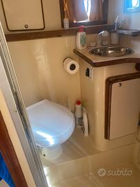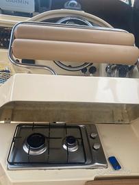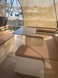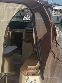 Solemar 32 Oceanic, NATANTE, motorizzato 2x250 HP Mercury Verado. Tessuto color Panna Exsclusive, Roll Bar in vetroresina con luci di via, asta porta bandiera con luce 360 e tromba acustica, tendalino parasole con arco inox sul roll bar e cappottina a chiusura totale, musone di prua in vetroresina con salpa ancora, completo di verricello elettrico, ancora e 50 Mt. di catena, consolle con parabrezza fumè, cuscineria nuova, tientibene in acciaio inox di prua e di poppa, divano poppiero con tavolo pranzo e completamento letto/prendisole, rivestimento in teak su piano di calpestio, plancette di poppa con rivestimento in teak, angolo cottura esterno con fornello a gas a due fuochi, lavello, frigorifero, doccia serbatoio e autoclave, arredamento cabina con letto matrimoniale di prua e letto di poppa, locale separato con wc elettrico, doccia e lavandino, interni in tessuto, N. 2 serbatoio carburante con strumenti indicatore livello, boiler acqua calda, carica batterie elettronico 220 V, presa di corrente 220 V in cabina, VHF con DSC, plotter a colori ed ecoscandaglio, radio stereo, bussola, pompa di sentina manuale ed automatica, scaletta di risalita. Si valutano permute: BWA, Joker Boat, Nuova Jolly, Magazzù, Zar, Stingher, Sacs, Lomac, Salpa.