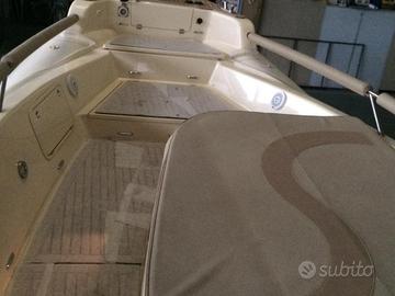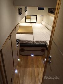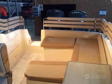 Bellissimo Solemar 33 Night&Day, Natante, motorizzato con 2x350 Yamaha. Battello di ultima generazione, con il comodo passaggio per recarsi a prua ed interni in pelle di ultimo design. Full optional: tessuto color Panna Exsclusive, Roll Bar in vetroresina con luci di via, asta porta bandiera con luce 360 e tromba acustica, tendalino parasole con arco inox sul roll bar, copri consolle, musone di prua in vetroresina con salpa ancora, completo di verricello elettrico, ancora e 70 Mt. di catena, consolle con parabrezza fumè, check panel elettronico, cuscineria prendisole di prua, cuscineria prendisole di poppa, tientibene in acciaio inox di prua e di poppa tripli per un maggior confort, divano poppiero con tavolo pranzo e completamento letto/prendisole, rivestimento in teak su piano di calpestio, plancette di poppa con rivestimento in teak, angolo cottura esterno con piastre elettriche, lavello, frigorifero esterno, alza portellone idraulico di poppa, doccia serbatoio e autoclave, arredamento cabina con letto matrimoniale di prua e letto di poppa, locale separato con wc elettrico, doccia e lavandino, interni in pelle, N. 2 serbatoio carburante con strumenti indicatore livello, boiler acqua calda, carica batterie elettronico 220 V, presa di corrente 220 V in cabina, VHF con DSC, impianto TV con antenna digitale terrestre, navigatore GPS a colori Furuno, con ecoscandaglio, pilota automatico e radar, radio stereo Fusion, contacatena elettronico, bussola, faro girevole con joystick su consolle, pompa di sentina manuale ed automatica, scaletta di risalita, gonfiatore tubolari elettrico, Generatore 4 Kw, pompa di calore per aria condizionata e riscaldamento. Richiesta € 80.000 + saldo finanziamento.