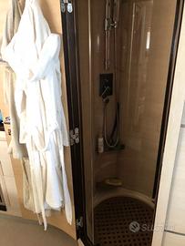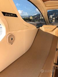 Solemar 37 Oceanic, Anno 2014, motorizzato con 2x370 HP Volvo Penta, NATANTE. Battello full optionals, tessuto Color Panna Exsclusive, Soft Top apribile, luci di via, asta porta bandiera con luce 360 e tromba acustica, tendalino parasole, cappottina a chiusura totale, teli vedo non vedo, musone di prua in vetroresina con salpa ancora, completo di verricello elettrico, ancora e catena, consolle con parabrezza fumè, check panel elettronico, volante sportivo, cuscineria prendisole di prua e di poppa, tientibene in acciaio inox di prua e di poppa, divano poppiero con tavolo pranzo e completamento letto/prendisole, rivestimento in teak su piano di calpestio, plancia di poppa con rivestimento in teak, angolo cottura esterno con piastre elettriche, lavello inox, frigorifero esterno, frigorifero interno, alza portellone idraulico di poppa, doccia serbatoio e autoclave, doccetta sul musone di prua, arredamento cabina con letto matrimoniale di prua e di poppa, locale separato con wc, box doccia e lavandino, impianto luci di cortesia azzurre, interni e divano in pelle, passerella idraulica di poppa, elica di prua, aria condizionata e riscaldamento, boiler acqua calda, carica batterie elettronico 220 V, prese di corrente 220 V in cabina, VHF con DSC, impianto TV con antenna satellitare, due plotter GPS a colori con ecoscandaglio di marca Furuno 14", radio stereo Fusion, pilota automatico, contacatena elettronico, bussola, faro girevole con joystick su consolle, scaletta di risalita a scomparsa, gonfiatore tubolari elettrico, cancelletto di poppa, generatore 3 KW, N. 2 serbatoi carburante, 1 serbatoio acqua potabile, serbatoio acque nere, luci di camminamento esterne azzurre e luci sotto la spiaggetta, Joystick di manovra. Richiesta 160.000 + saldo finanziamento. Si valutano permute: Salpa, Nuova Jolly, Joker Boat, Zar Formenti, Capelli.