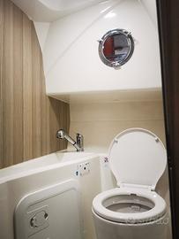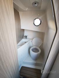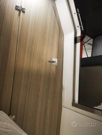 Presenta due posti letto interno cabina (lunghezza letto 2.10), un bagno completamente separato dove si sta completamente in piedi (altezza calcolata 1.75), una larghezza di 2.50m, una lunghezza di 5.85 m ed 8 persone a bordo.