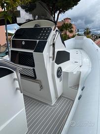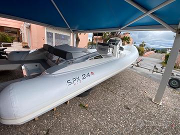 Vendesi SPX 24 nella ricercata versione Dinette, nuovo di fabbrica (marzo 2026). Gommone mai messo in acqua, ancora da motorizzare e in pronta consegna. Questa versione rappresenta il top della gamma per abitabilità e qualità dei materiali (Tubolari in Hypalon Orca 1670 dtex). Configurazione Ufficiale Casa Madre (Versione Dinette): Locale Bagno: Vano toilette separato in consolle con controstampa interna. Area Poppa: Salotto a "U" con schienali imbottiti e tavolo centrale (trasformabile in ampio prendisole). Rivestimento Premium: Full SeaDek (teak sintetico) grigio con fughe bianche su tutta la superficie. Area Cooking: Lavello in acciaio inox con rubinetto a scomparsa sotto il sedile guida. Verricello Elettrico: Già installato con ancora e catena in acciaio inox. Impianto Idrico: Doccetta esterna con serbatoio acqua dolce (ca. 100lt). Luci Full LED: Luci di via, luce di fondo e luci di cortesia nel pozzetto. Plancette di Poppa: Extra-large con scaletta di risalita telescopica a scomparsa. Optional Extra inclusi: Audio System: Impianto stereo professionale Hertz Marine con casse nautiche integrate. Timoneria: Idraulica completa con volante sportivo. MOTORIZZAZIONE: Il prezzo indicato si riferisce allo scafo nudo, ma offriamo la possibilità di motorizzazione con HONDA 250 HP nuovo (garanzia ufficiale Honda).
