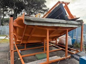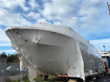In asta Stampo Scafo Exuma e Stampi Vari. Il lotto comprende: Stampo per Scafo Exuma: Collocato sotto telo, assenza di ristagni d'acqua o crepe; strutture hard top arrugginite. Stampi Vari: Componenti secondari (alberini, ghiotte, inserti) su pallet all'aperto senza protezione.