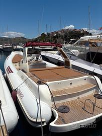 Il gommone monta due Mercruiser 6.2 MPI 320 Hp benzina, motore sinistro revisionato 2 anni fa, motore destro nuovo con fattura Mercruiser, velocità massima 45/50 nodi.