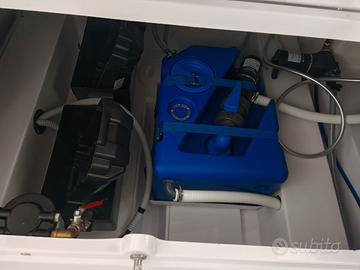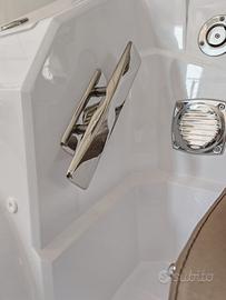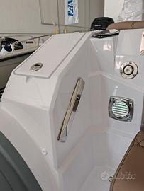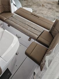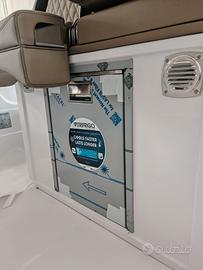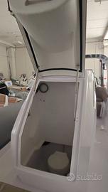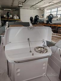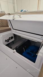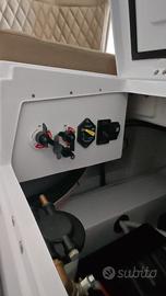 Consolle di guida completa, timoneria idraulica, vano toilette separato, seduta di guida, divano di poppa, prendisole di prua, pompa sentina, gonfiatore elettrico 12V. , scaletta da bagno, plancetta di poppa, impianto carburante, pannello interruttori e luci di navigazione, verricello elettrico, ancora e catena, lavello, tavolino, doccia esterna, Wc marino con serbatoio acque nere.