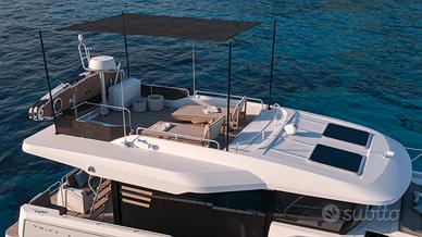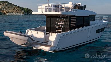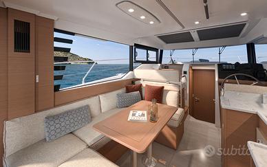 La versione Fly è dotata di un flybridge tradizionale, attrezzato con postazione di comando, divano a U, tavolo e frigo integrato.