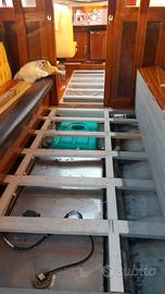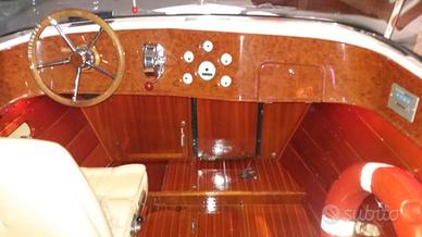 Internamente l' imbarcazione si presenta con paiolato in mogano sapelli 15/10 con filettatura in acero bianco, perline in mogano caia in cabina si ripresenta lo stesso tipo di paiolato in mogano e listelli in radica di olmo la più pregiata su diverse parti interne.