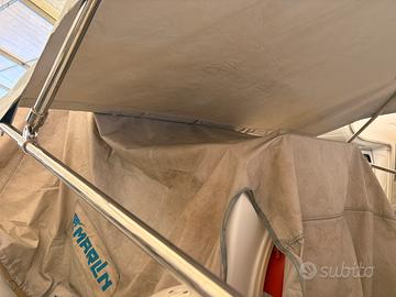 Vendo Tendalino acciaio inox tre archi in ottime condizioni larghezza 185 lunghezza 140 Il tendalino era montato su un motoscafo open fratelli Longo. Va bene per motoscafi non per gommoni in quanto risulta troppo basso e difficilmente modificabile